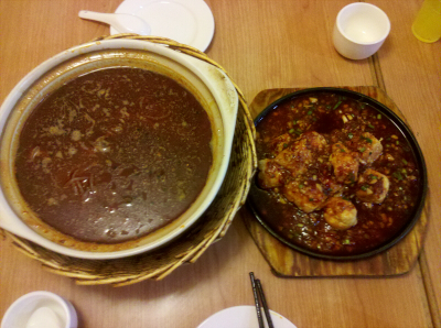 就是左邊那鍋味道濃烈的鮮紅的湯www雞翅鴨翅和粉條都沉在湯底了,看起來很微妙的感覺ww不過很好吃ww